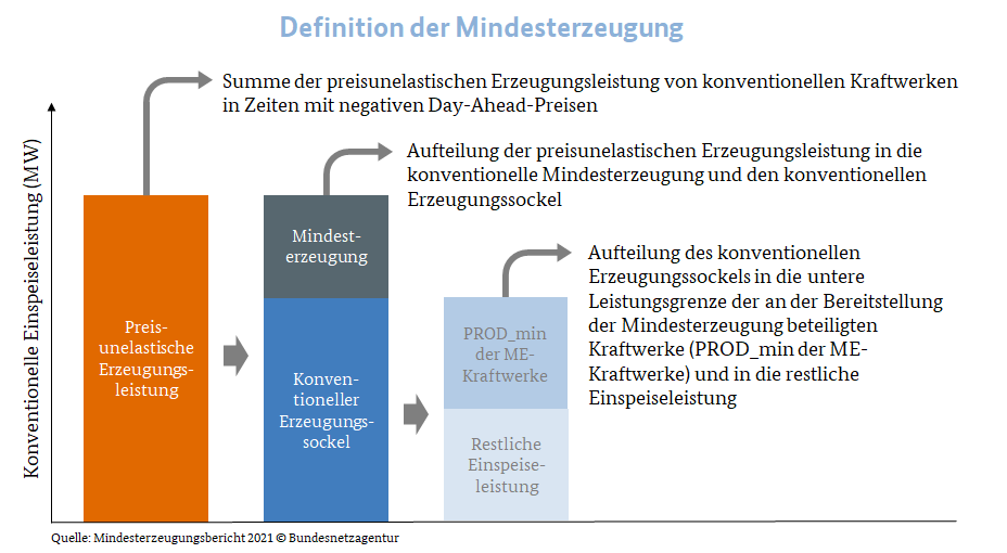 Der kleinere Anteil der konventionellen Kraftwerksleistung, der nur stark eingeschränkt auf Preise am Strommarkt reagiert (sogenannte preisunelastische konventionelle Erzeugungsleistung), ist für das Funktionieren der Netze erforderlich. Dieser Teil wird als Mindesterzeugung bezeichnet.