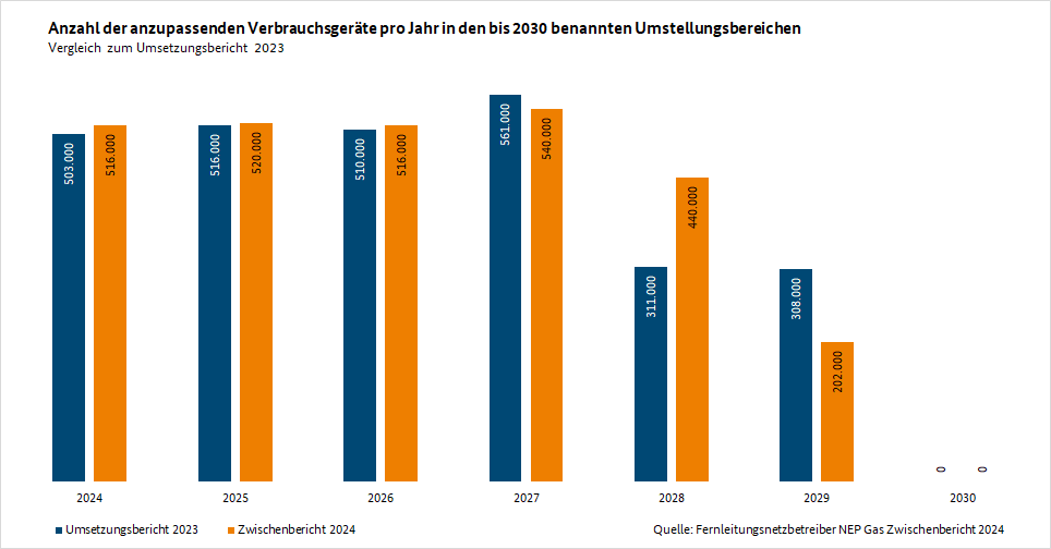 Nach aktuellem Stand soll ab dem 1. Oktober 2029 kein niederländisches L-Gas mehr nach Deutschland fließen. Wegen des Rückgangs der heimischen L-Gas-Produktion und des L-Gas-Importes aus den Niederlanden müssen in den Netzgebieten, in denen zur Zeit L-Gas verbraucht wird, die Netze umgestellt und alle angeschlossenen Gasverbrauchsgeräte schrittweise und möglichst frühzeitig an die Versorgung mit hochkalorischem H-Gas angepasst werden. Die Größenordnung der Gasgeräte, die pro Jahr umgestellt werden müssen, zeigt die folgende Grafik.